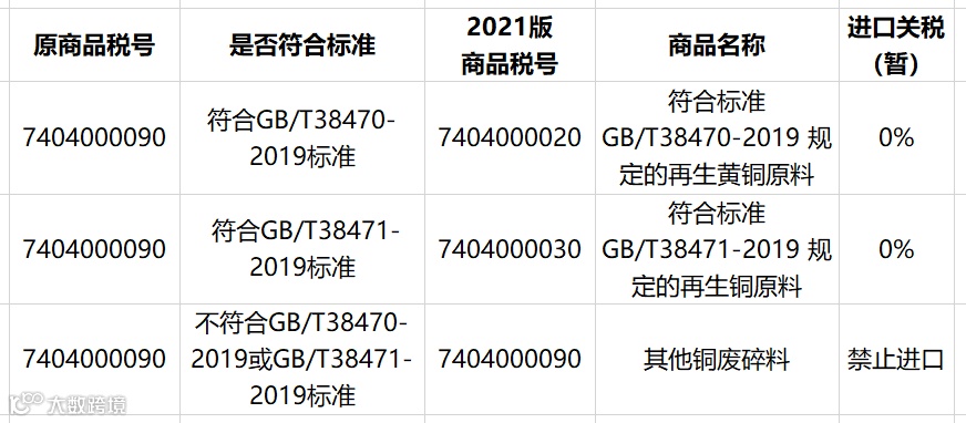 2021版税则当中,再生铜原料相关产品归入7404项下,符合标准GB/T38470-2019规定的再生黄铜原料归入7404000020,符合标准GB/T38471-2019 规定的再生铜原料归入7404000030,两项均暂定进口关税为0%,均可直接按照普通商品进口。不符合GB/T38470-2019或GB/T38471-2019标准禁止进口。