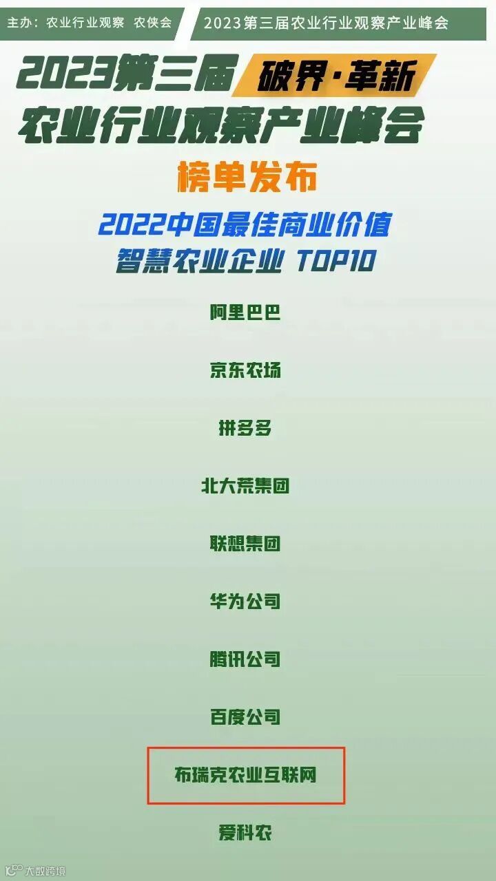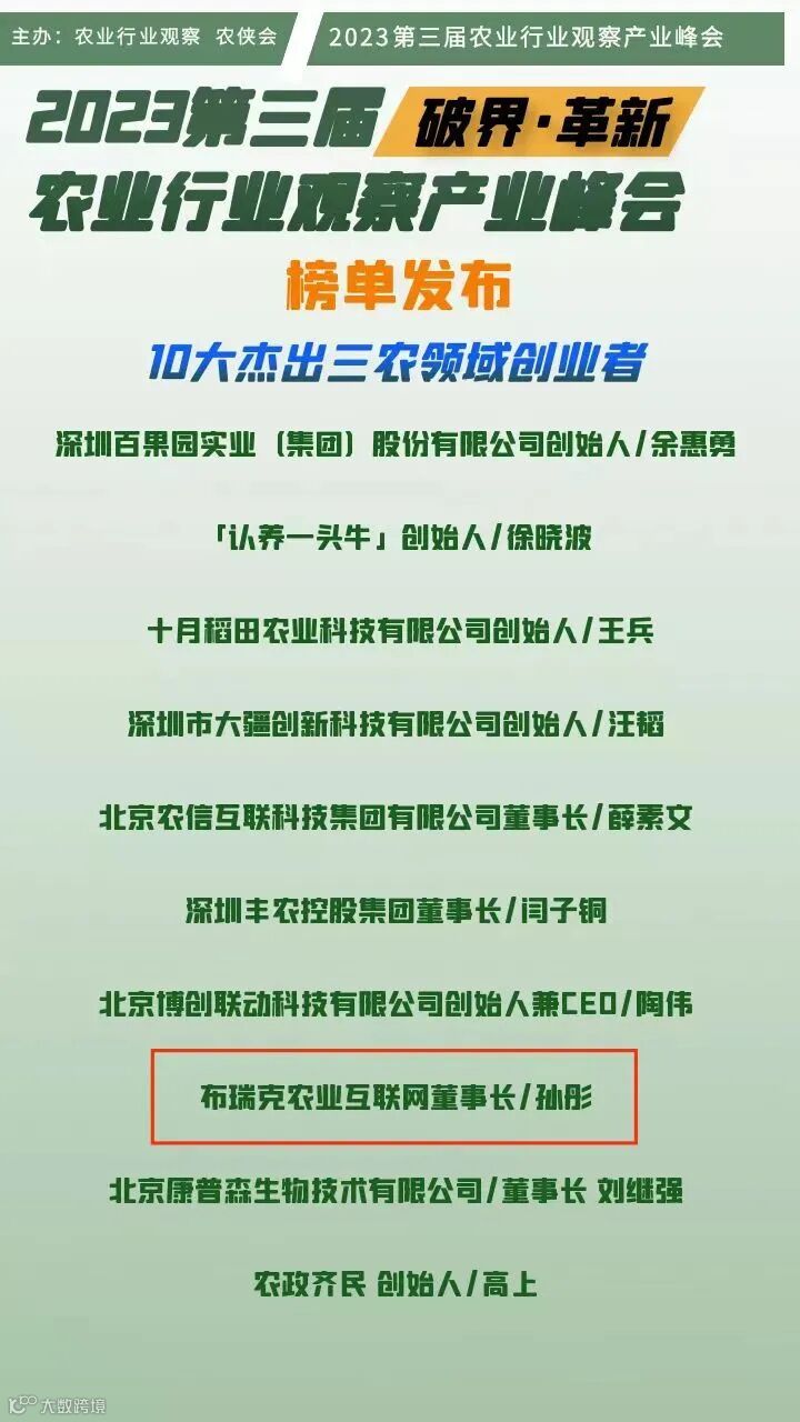 1月10日,由农业行业观察、农侠会主办的以破界•革新为主题的2023第三届农业行业观察产业峰会圆满落下帷幕。在本次峰会上,农牧人母公司布瑞克农业互联网董事长孙彤荣获“10大杰出三农领域创业者”、布瑞克农业互联网荣获“2022中国最佳商业价值智慧农业企业top10”、农牧人荣获“2022三农领域未来之星top50榜单”。