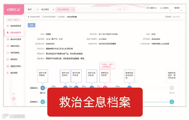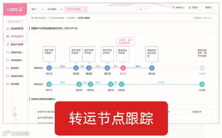 系统对院前急救到院内抢救的各节点实时跟踪,展示各节点耗时与标准耗时的差距,并提供各节点生命体征记录存档,支撑各级机构危重救治的快速响应。