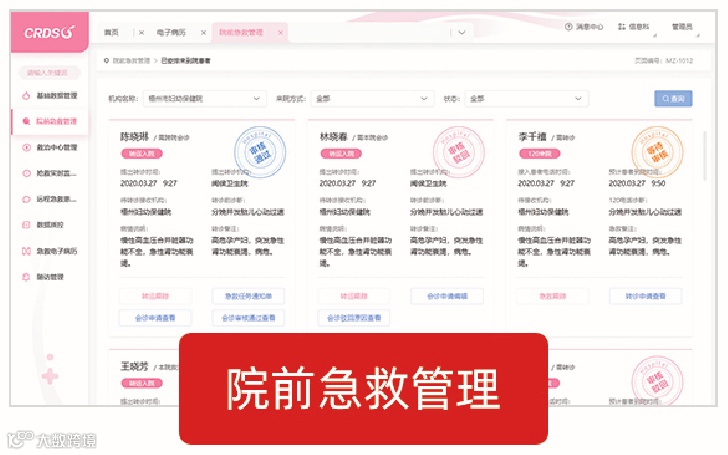发起危重救治时,系统自动向医院人员推送危重病情评估、转诊审核、急救任务等提醒信息,通过web、小程序、短信多端进行智能提醒。院中救治中心急救处理,将收到自动生成的急救电子病历、进行专科会诊,对救治过程进行质控。院后制定个性化康复计划,具有随访功能。