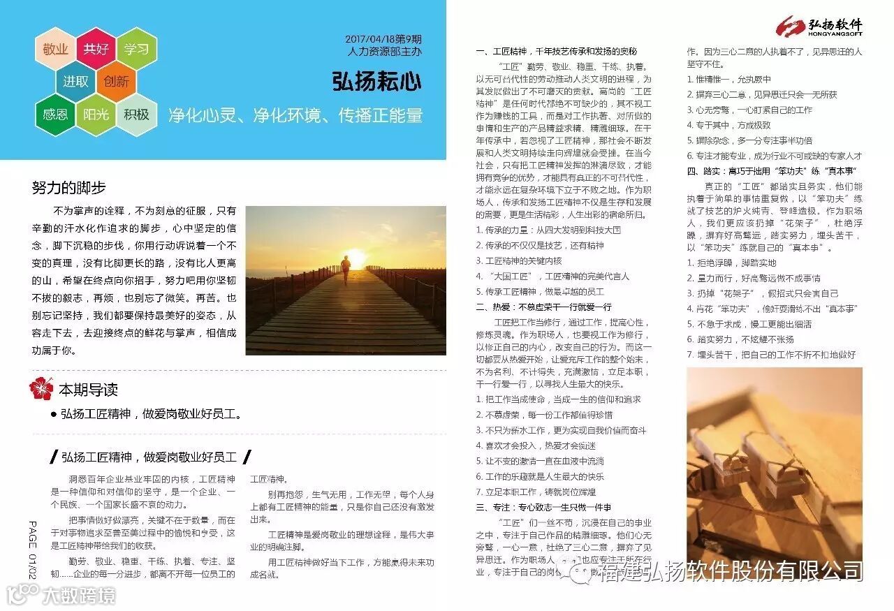 弘扬软件股份有限公司不为掌声的诠释,不为刻意的征服,只有辛勤的汗水化作追求的脚步,心中坚定的信念,脚下沉稳的步伐,你用行动诉说着一个不变的真理,没有比脚更长的路,没有比人更高的山,希望在终点向你招手,努力吧用你坚韧不拔的毅志,去迎接终点的鲜花与掌声,相信成功属于你。