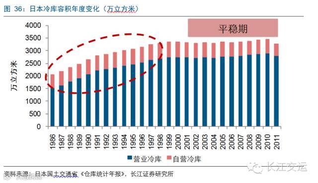 完善的法律法规对冷链物流行业加以规范和引导,同时受到经济高速增长和生活习惯改变的影响,日本冷链物流业在20世纪80至90年代迎来了发展高峰期,冷库容量增速非常之快,经过30多年的发展,日本已经构建了完备的从产地到终端消费地的冷链物流系统,2011年与1986年相比,冷库容积增加了1208万立方米达到3266万立方米,从日本冷库容量数据来看,日本冷链物流产业已经进入了平稳发展期。