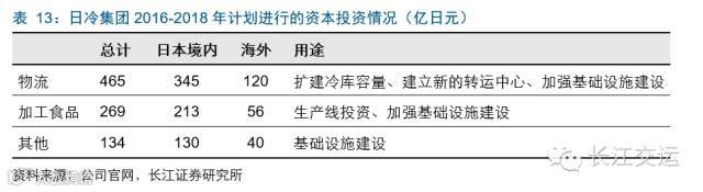未来,日冷仍将持续大力投资冷链物流基础设施建设,公司计划在2016-2018年增加465亿日元投资用以扩建冷库容量、建立新的转运中心,预计投资额远超过日冷集团旗下的加工食品资本投资额,可见日冷物流已经是集团最为重视的一个子公司,且日冷物流的冷库容量有望进一步扩展。
