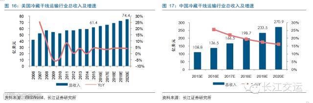 2015年美国冷藏干线运输行业总收入为61.4亿美元,而中国为108.8亿美元,从规模上看,中国冷藏干线运输行业规模要大于美国;从规模增速来看,美国冷藏干线运输行业市场规模增速为5%左右,而根据业内人士一致估计,未来3-5年中国冷藏干线运输行业东部发达地区年增速30%,西部欠发达地区年增速10%,综合增速在15%-20%之间。