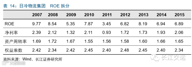 从盈利能力上来看,国内的冷藏干线运输商ROE主要来源于销售净利率。2015年浩嘉冷链去杠杆将权益乘数降低到1.73,控制了经营风险,同时,由于整个行业处于发展初期,下游客户资源尚不稳定,中小客户业务比重的增加使得公司销售净利率大幅提升。作为典型的重资产经营的冷藏干线运输行业,企业资产周转率难有大的突破,赚的仍是辛苦钱,这也是冷藏干线运输企业普遍主业纯度不高,兼营低温仓储、供应链等服务的重要原因之一。