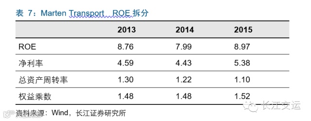 从盈利能力上来看,由于冷藏干线运输企业属于重资产的传统整车运输商,总资产周转率很难超越1.5的行业上限,同时由于进入门槛低、下游客户集中度高于本行业集中度,也难以获得较高的净利率(一般低于5%)。因此,ROE 的差别主要来自于公司的杠杆率,而较高的杠杆率也意味着较大的经营风险,马尔登运输公司属于行业领先企业,下游客户相对稳定,盈利模式相对成熟,公司杠杆率在1.5左右,在控制经营风险的同时,获得较为稳定的ROE。