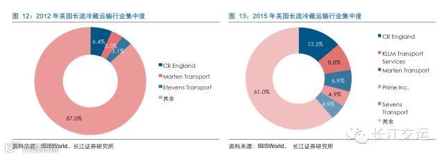 1)行业所处阶段不同,公司规模差距大。美国前五大冷藏干线运输公司无论在员工数量还是冷藏车数量上都远远超过国内的领先企业,运力和人力资源上的优势使得美国龙头冷藏干线运输公司能够牢固占有自己的市场份额,而中国小规模公司众多,还没有脱颖而出的大规模的领头羊企业,因此集中度相对美国来说更低。