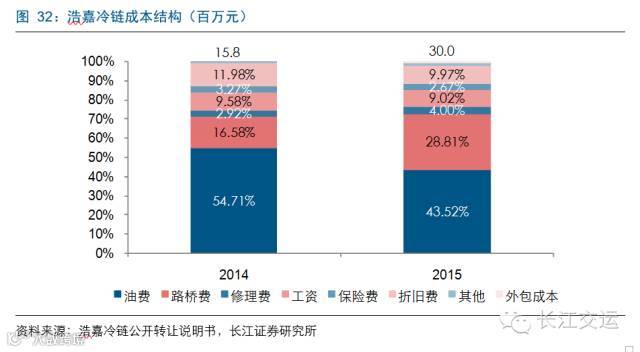 2014-2015年,浩嘉冷链毛利率分别为10.29%、17.29%,处于同行业较高水平,且高于美国马尔登运输公司7%-9%的毛利率,主要原因在于:1)近年来公司对大客户的依赖程度有所降低,2015年营业收入来自于前五名客户的占比下降到63%,中小客户业务比重逐渐增加,而中小客户运输业务毛利率较长期客户高,拉动了公司整体运输业务毛利率;2)冷藏干线运输行业盈利水平受油价影响较大,成本中油费占到40%-60%,2015年国家发改委调整油价,每升降低0.62元,营业成本增幅小于营业收入增幅(营业收入增幅100.3%,营业成本增幅84.7%),使得公司毛利率得到进一步的提升。
