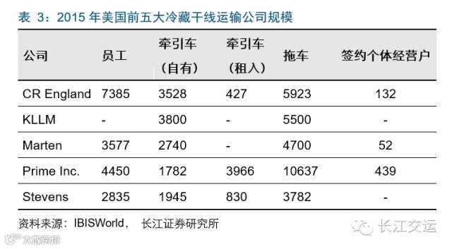 由于分工明确,美国冷藏干线运输公司主业经营的纯度较高,即使同时经营其他业务,也基本限定于运输业务(如专用运输、多式联运),而不包括仓储、分拣、加工等业务。2015年美国冷藏干线运输行业总收入为61亿美元,其中冷藏卡车运输服务占比在2/3;行业排名第一位的C.R. England的营业收入15.17亿美元中有65%来自于冷链干线运输;排名第三位的马尔登运输公司(MartenTransport)的营业收入6.65亿美元中接近60%来自于冷藏干线运输。