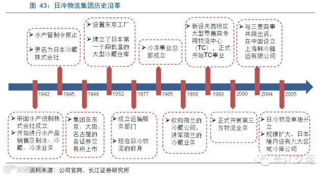 日冷物流集团是日本最大的冷库企业,在日本和海外共拥有123个配送中心,总库容达到1730千吨,在世界冷库运营商中排名第五位;其在日本境内有76座冷库,总库容为1430千吨,占日本冷库总库容的14%。日冷物流拥有先进的冷链物流技术体系、精细化的管理水平和自动化程度,我们以其发展历程为鉴,研究和分析中国冷库行业的发展趋势。