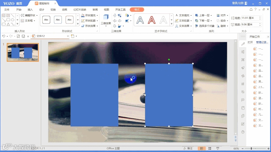 4、双击第二个矩形,进入图形的格式界面,将其填充为“渐变色”,将透明度设置在70%左右,点击“确认”。