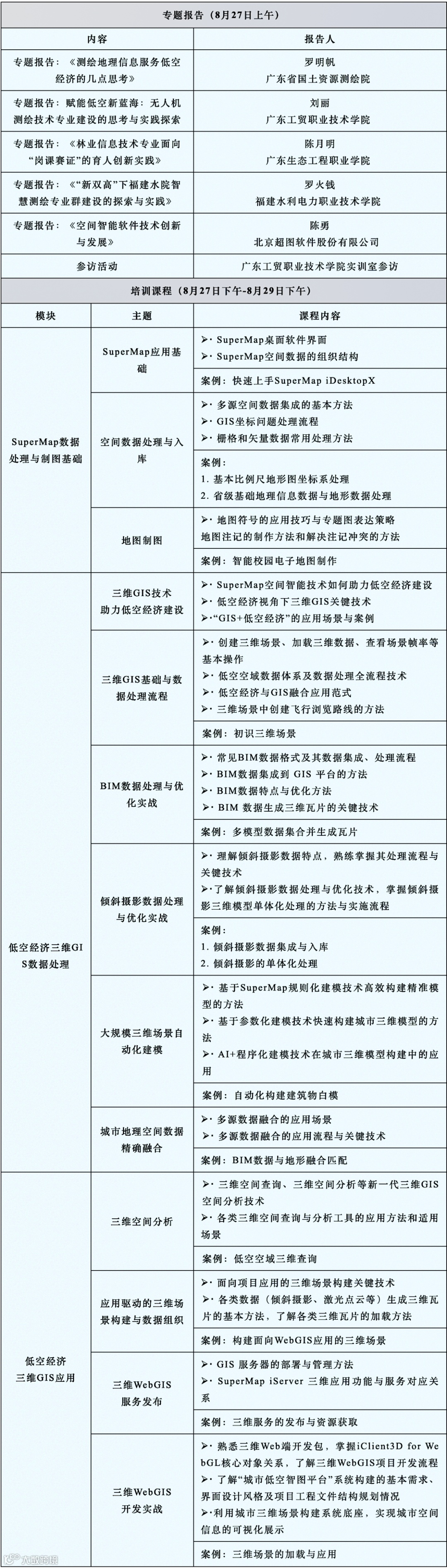 为促进地理信息系统(GIS)技术在职业教育领域的应用与发展,加强院校间的交流合作,提升师生GIS技术实践能力,广东省测绘学会决定联合广东工贸职业技术学院共同主办2025年暑假“华南大区职业院校GIS技术培训班”。本次培训班面向职业院校教师专场,聚焦应用型与技能型人才培养的差异化需求,助力教师提升教学能力与产业实践融合水平,欢迎报名参加。现将有关事项通知如下: