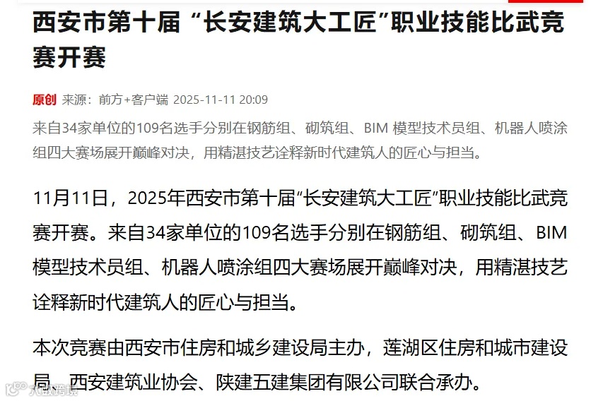 11 月 11 日,2025 年西安市第十届 “长安建筑大工匠” 职业技能比武竞赛在西安延腾置业自建住房项目工程二标段盛大开赛。来自 34 家单位的 109 名建筑技能精英同台竞技,用精湛技艺诠释新时代建筑人的匠心与担当。本次比赛首次将室内喷涂机器人纳入赛事项目,我司总经理艾毅雄先生受邀担当赛事评委,全程见证这场传统工艺与前沿技术碰撞的技术赛事,而竞赛中机器人喷涂项目所使用的室内喷涂机器人由智匠未来提供。
