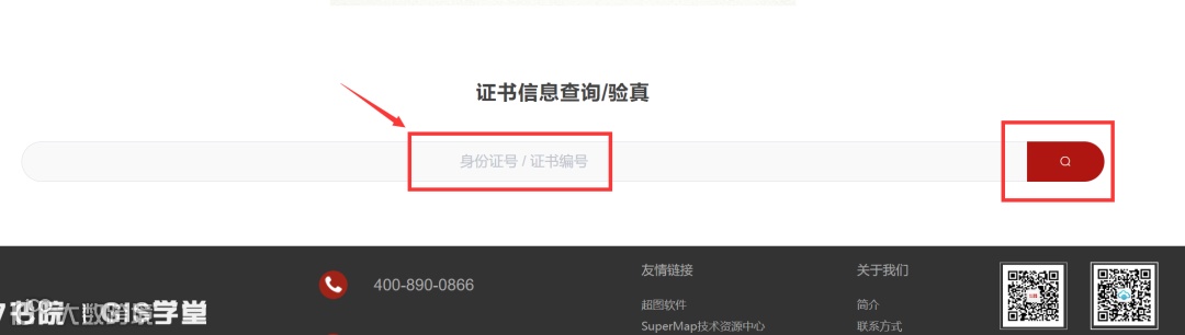 进入917书院GIS学堂(打开网址:https://edu.supermap.com),访问“能力认证”模块,点击上方查询成绩按钮,输入身份证号即可进行查询,具体步骤如下截图: