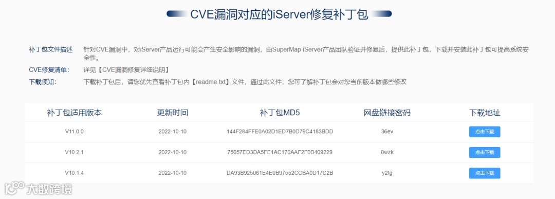 基于以上原则与流程,我们推出了SuperMap GIS基础软件CVE漏洞修复公告站点。您可以在SuperMap官方网站进入技术资源中心>软件下载>漏洞修复页面进行查看和下载补丁包(点击下方的阅读原文可进行访问)。