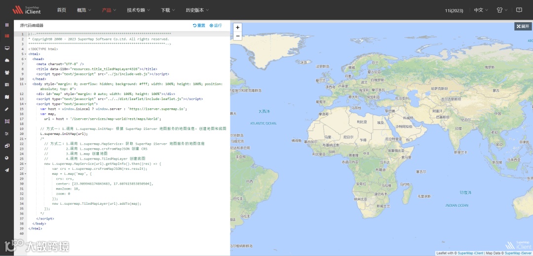 针对不同GIS开发API,超图提供有对应的二次开发API,包括iClient for Leaflet、iClient for OpenLayers、iClient for MapboxGL、iClient for MapLibreGL、iClient3D for WebGL等,配以开发指南、API文档与在线调试示例,访问地址https://iclient.supermap.io/