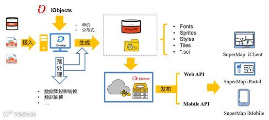 SuperMap中矢量瓦片技术基于SuperMap GIS平台产品,主要通过SuperMap iDesktop实现GIS数据预处理和配图等工作;通过SuperMap iDesktop实现地图切图,生成矢量瓦片,支持单任务和多任务切图;通过SuperMap iServer实现矢量瓦片数据的服务发布;通过SuperMap iClient、SuperMap iMobile、SuperMap iPortal实现矢量瓦片数据的可视化展示。