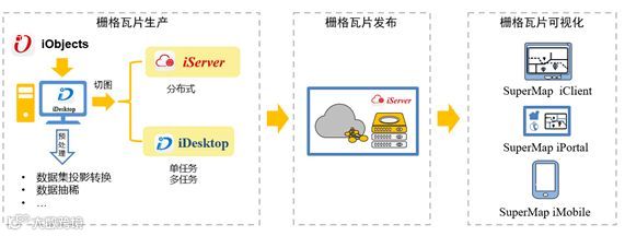 SuperMap中栅格瓦片技术基于SuperMap GIS平台产品,主要通过SuperMap iDesktop实现GIS数据的分析、处理和制图等工作;通过SuperMap iDesktop和SuperMap iServer实现地图切图,生成栅格瓦片;通过SuperMap iServer实现栅格瓦片的服务发布;通过SuperMap iClient、SuperMap iMobile、SuperMap iPortal实现栅格瓦片数据的可视化展示。