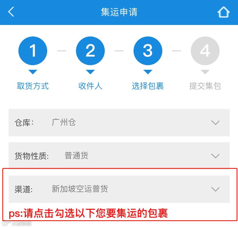 包裹入库后,选择“申请打包”,根据步骤填写收货地址; |