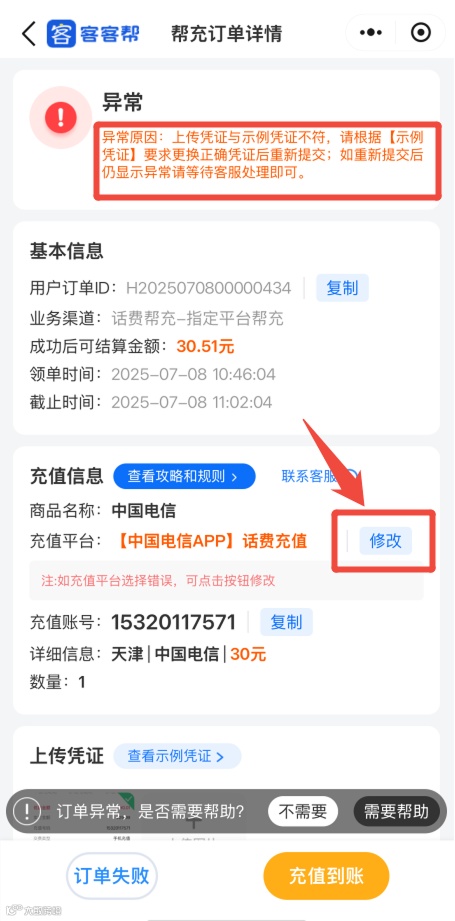 首先检查选择的充值平台和上传凭证的充值平台是否一致,如果不一致,就马上点击【修改】,修改为实际充值渠道后,再次上报充值到账。