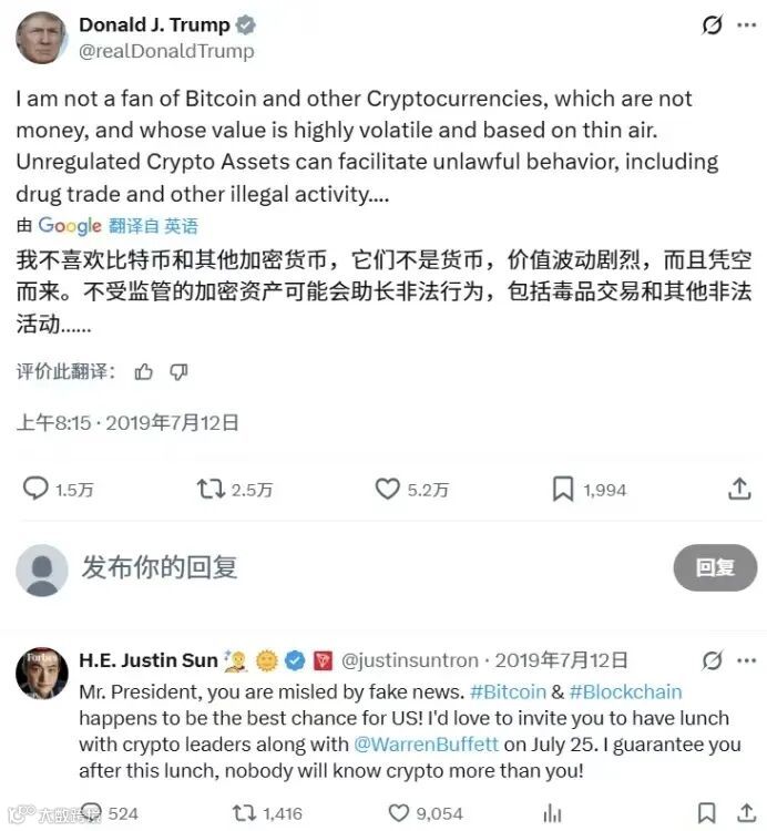时间拉回2019年,特朗普在推特上直接开炮:“我不喜欢比特币和其他加密货币,它们根本不算钱,价格跟坐过山车似的,完全没根基。