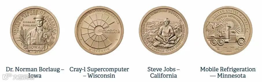 与乔布斯一同发行的另外三枚硬币,同样印证了“创新改变生活” 的理念:爱荷华州的诺曼・博洛格博士,用杂交水稻技术养活了全球数十亿人;