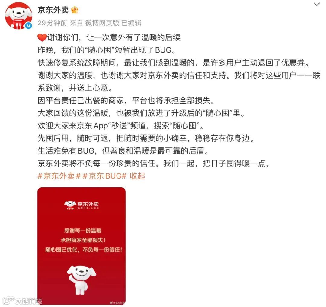 更关键的是,当晚京东外卖官方发文,明确承诺承担已出餐商家的全部损失,还特意感谢主动退回优惠券的用户。