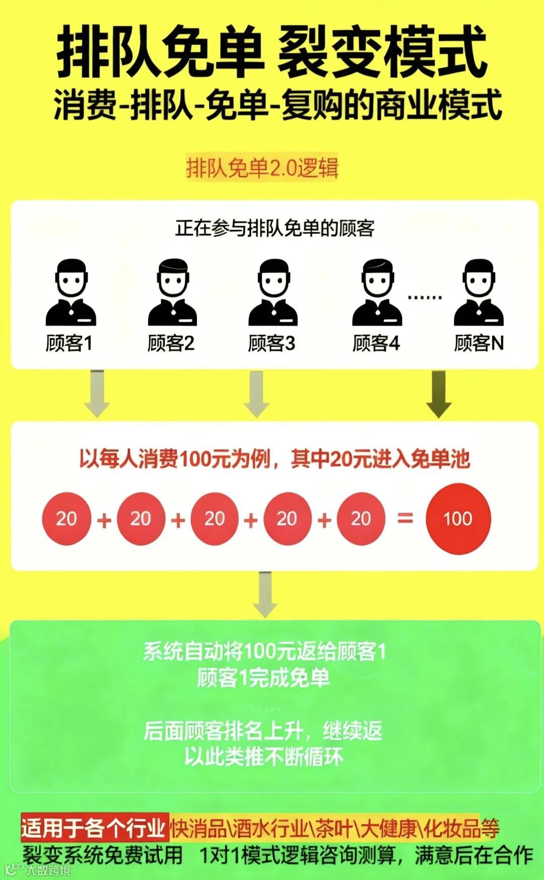 ✅ 当池子里的钱凑够第一位顾客的消费额,他就全额免单,退出队列;✅ 后面的人依次前移,循环返现。