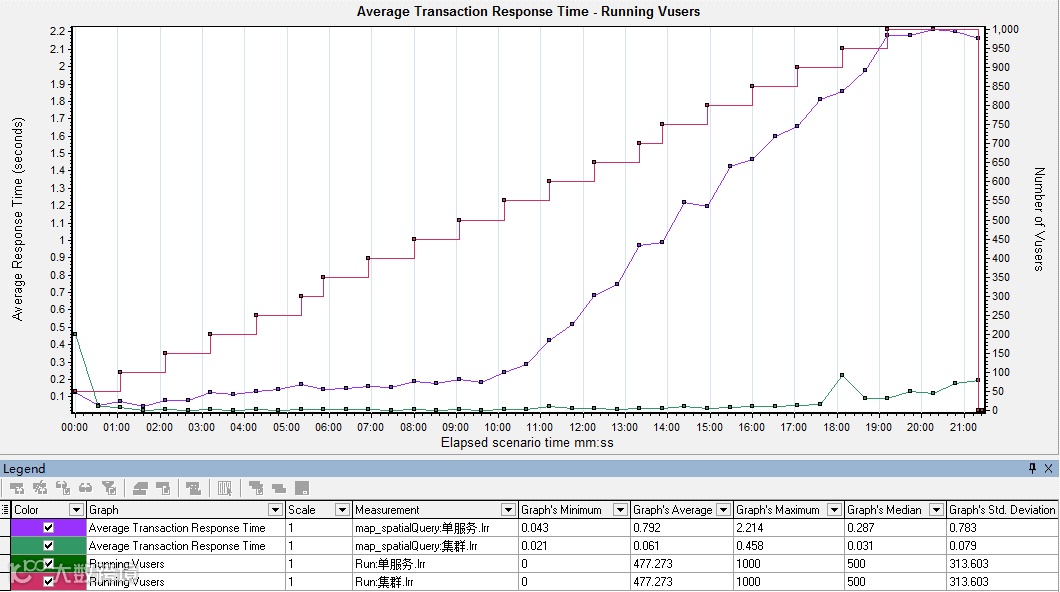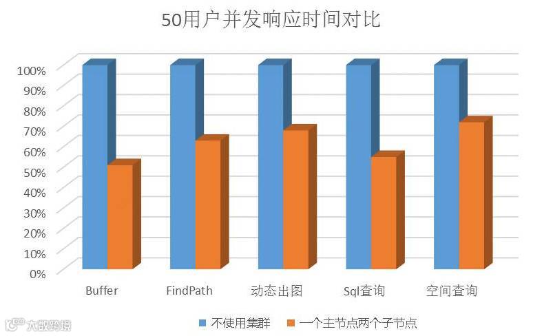 以SuperMap iServer 集群为例,50个用户并发访问(同时访问)GIS服务,从是否搭建集群,服务器响应时间的对比测试中可以看到: