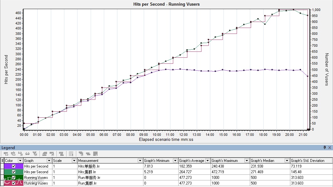 再看上图点击数(点击数用来评估用户产生的负载量,是测试服务性能的重要指标)。红色线代表用户数,紫色线代表单机,绿色线代表集群。随着用户数量(红色线)的增加,单机(紫色线)当每秒点击数量达到240次左右到达极限,同一时间内,集群模式(绿色线)每秒点击数量持续大幅增长中。最终,当增加到1000用户数,未使用集群每秒点击数量最大可到240次,而使用了集群,每秒点击数量可以达到472次。