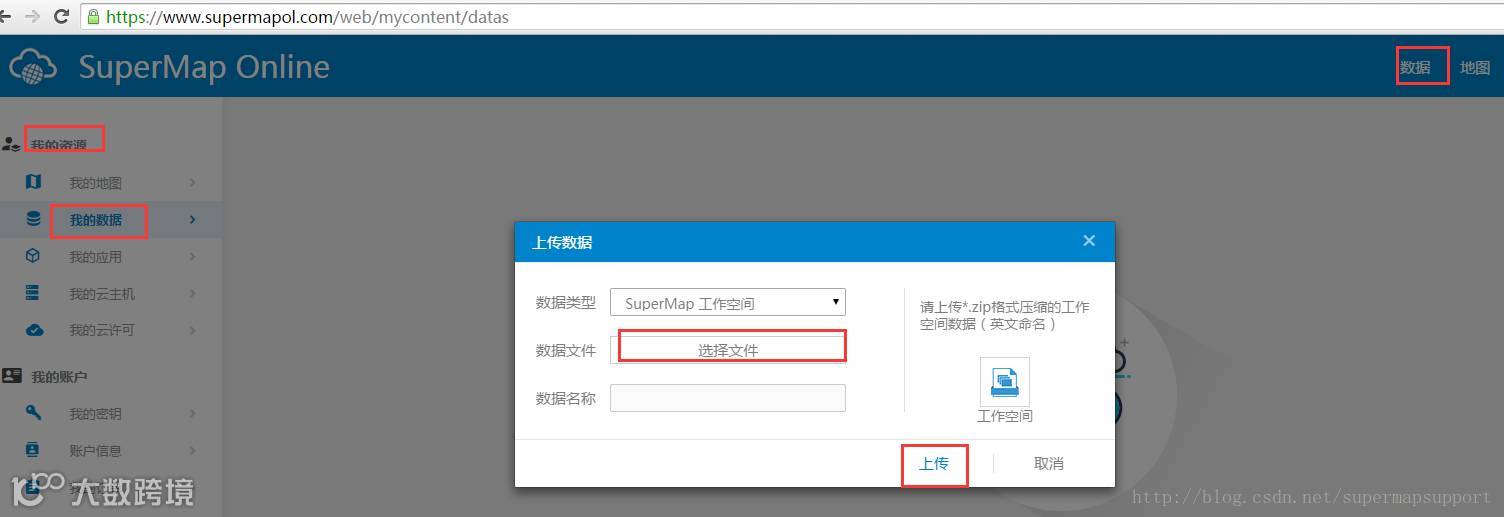 登入后,点击【数据】-【上传数据】进入【我的资源】,在【我的数据】中点【上传数据】即可,然后根据提示选要上传的zip包数据,最后点上传,如下图: