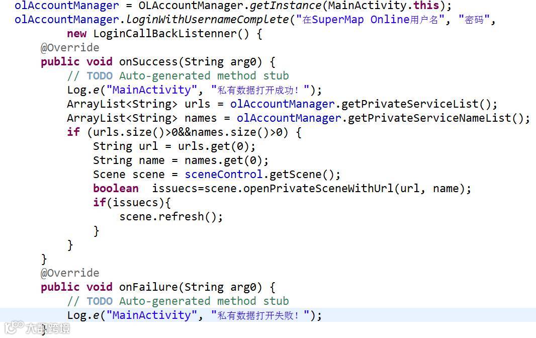 在SuperMap Online发布了私有的三维数据后,在iMobile for Android先要登入Online,然后在获取私有的服务数据,最后加载到场景中,关键代码如下: