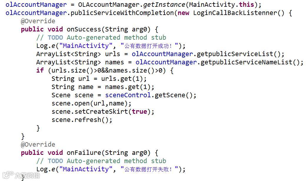SuperMap Online上的公有数据只有Online的管理员才能发布,用iMobile for Android对接的时候不需要登入自己的Online用户,直接获取公有的服务数据,然后加载到场景中,实现的关键代码如下: