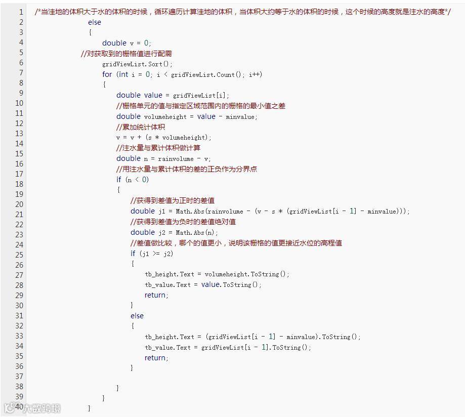 2.如果当洼地的体积>注水的体积的时候,循环累积该范围内每个栅格与最底栅格构成的洼地体积,当遍历到体积接近注入量的时候,这个时候的高度就是注水的高度。