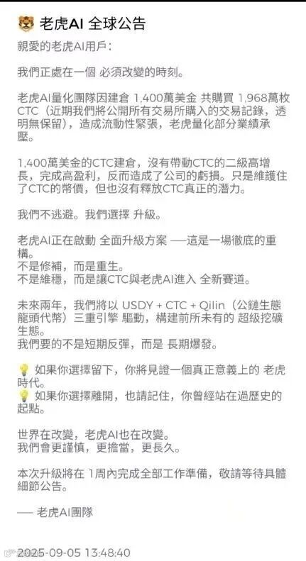 “系统性攻击”的借口:2025年9月2日,老虎AI发布公告,称其系统“遭受到系统性攻击”,导致其平台币CTC价格“恐慌性暴跌”,并因此宣布“暂时关闭充值与提现功能”,预计需要72小时修复。