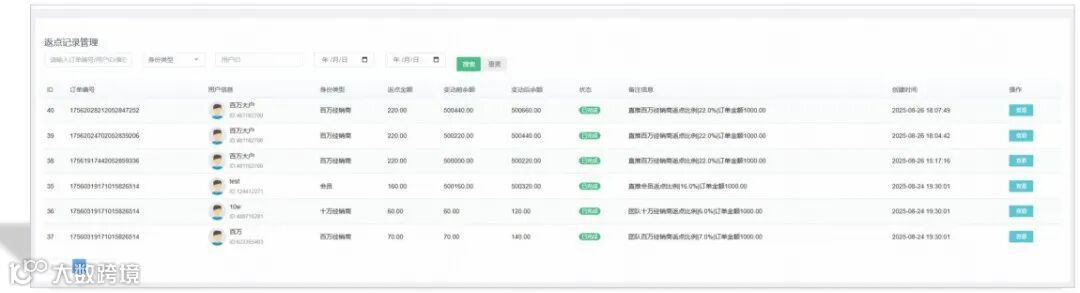 - 分销管理:会员 / 达标服务商 / 招商总监分红设置(如百万服务商自购利润 21%)、返点记录(用户信息、奖金金额等)。