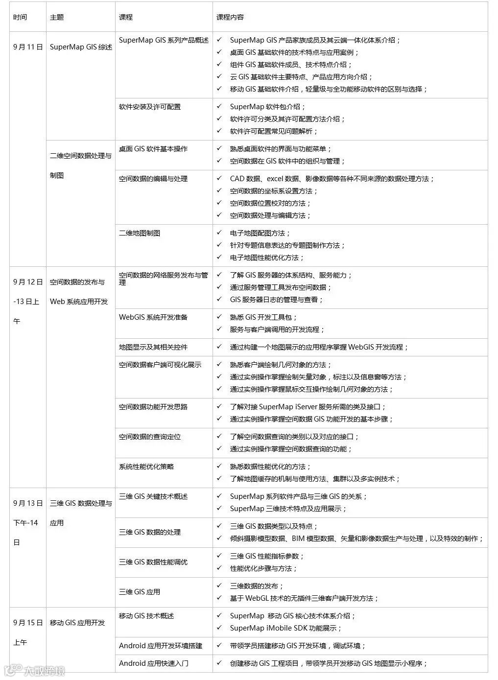 相约9月,SuperMap GIS基础软件技术培训班北京站开始招生了,本次培训旨在提升学员对SuperMap 软件技术的应用水平,主要内容包括GIS项目中如何使用SuperMap软件进行空间数据的处理与优化、WebGIS项目中如何使用iServer管理GIS服务并实现GIS应用开发、三维GIS项目中如何进行数据的处理与优化并实现三维项目开发,以及移动GIS项目中如何快速掌握开发流程与方法。