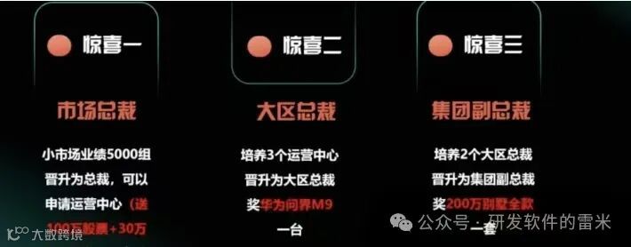 培养3个运营中心升级为“大区总裁”,奖励华为问界M9;培养2个大区总裁成为“集团副总裁”,获200万别墅全款。