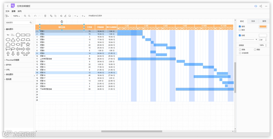 具体怎样从理论落实到实践中,其实用一张甘特图就可以简单明了地表达清楚。永中优云流程图功能包含多套模板,其中就有“甘特图”,你可以直接套用,罗列出今年要完成什么项目,在何时能完成到何种程度,这个项目是否在预期内、是否适用于现阶段工作方向,以及预计能在何时完成。