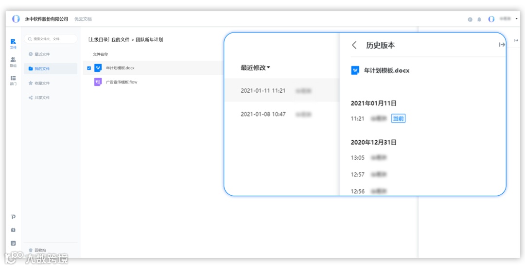 如果文档被队友误改了怎么办?不用担心!永中优云会自动保存每一步更改,生成对应的历史版本文件,找到你想要恢复的版本,随时可以一键找回。