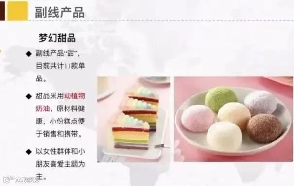 遇见小黄鸭的副线产品包括时尚饮品和梦幻甜品。时尚饮品以鲜榨果茶为主,健康卫生;梦幻甜品则采用动植物奶油,原材料健康,小份糕点便于销售和携带。这些产品,都非常符合年轻人的消费习惯和社交需求。