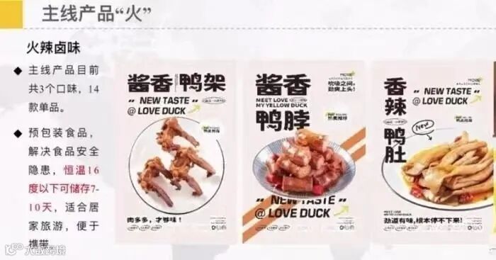 遇见小黄鸭的主线产品是休闲卤味,目前共有3个口味,14款单品。他们的产品采用预包装形式,解决了食品安全隐患,恒温16度以下可储存7 - 10天,非常适合居家旅游,便于携带。