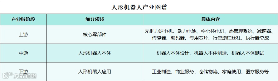 人形机器人产业链上游硬件为零部件供应,核心零部件包括谐波减速器、无框力矩电机、空心杯电机、行星滚柱丝杠、编码器、传感器、轴承等;软件算法部分包括高动态性能的控制算法(小脑)、具有泛化性的具身智能及非常接近人的通用人工智能(机器人“大脑”)。