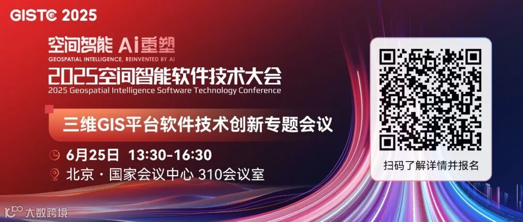 6月24日-25日,2025(第十九届)空间智能软件技术大会将在北京・国家会议中心(北京市朝阳区天辰东路7号)举办,涵盖1天主题大会、19场(含闭门)专题会议、2天互动体验与展览,聚焦AI驱动下的空间智能软件技术升级和应用创新,邀请海内外政府部门领导、院士及权威专家、IT领军企业精英、地信名企高管等嘉宾围绕多个议题开展深度研讨,诚邀您报名参会,与30多个国家和地区6000余位嘉宾共同见证!欢迎扫描图片二维码或点击文末「阅读原文」报名,期待您的莅临!