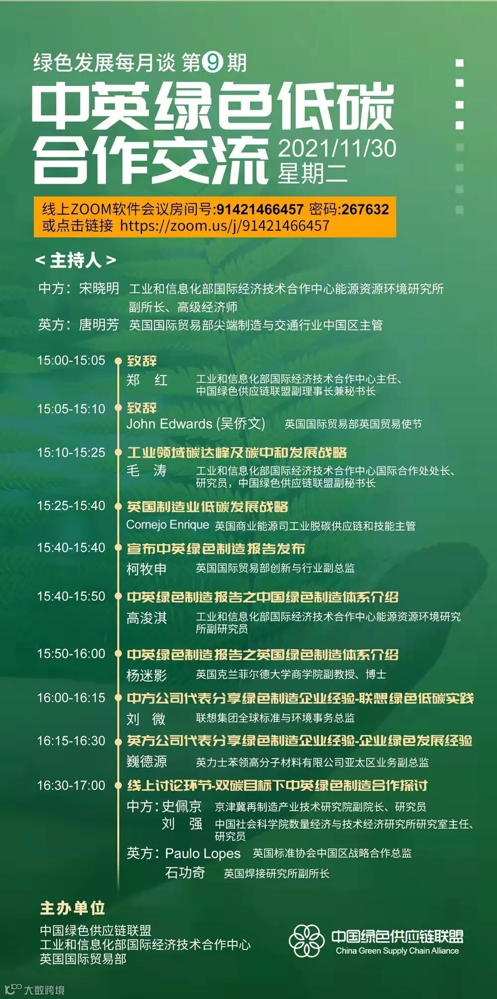 导读:第9期绿色发展每月谈:中英绿色低碳合作交流2021年11月30日(周二)15:00-17:00线上ZOOM