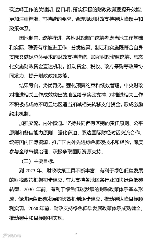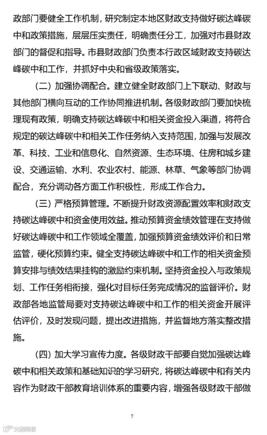 为贯彻落实党中央、国务院关于推进碳达峰碳中和的重大决策部署,充分发挥财政职能作用,推动如期实现碳达峰碳中和目标,现将《财政支持做好碳达峰碳中和工作的意见》印发给你们,请遵照执行。