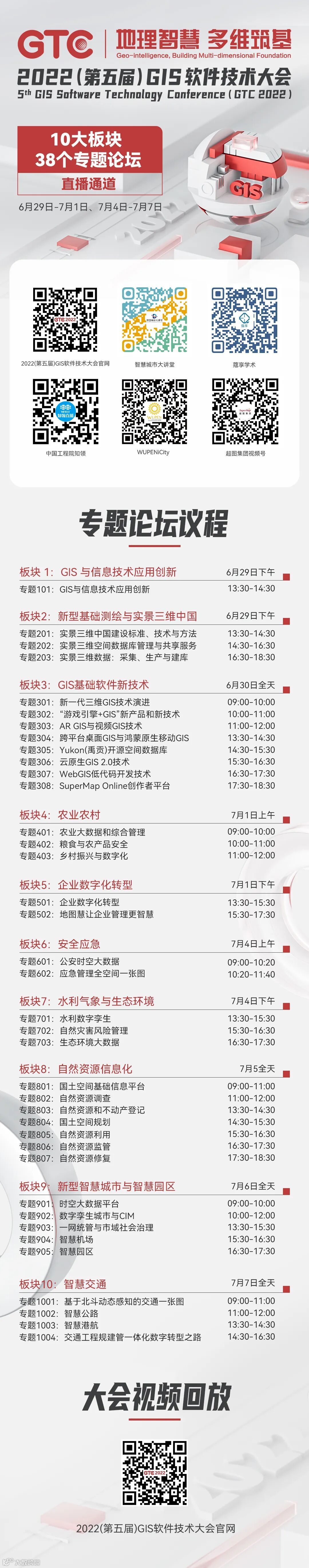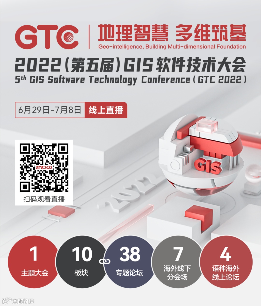 6月29日-7月8日,由中国科学技术协会指导,以“地理智慧 多维筑基”为主题的2022(第五届)GIS软件技术大会(简称GTC 2022)在线上召开。期间,10大板块38个专题论坛先后在线直播,涵盖信创、新型基础测绘、实景三维中国、农业农村、安全应急、自然资源信息化、智慧城市、交通等多个领域。