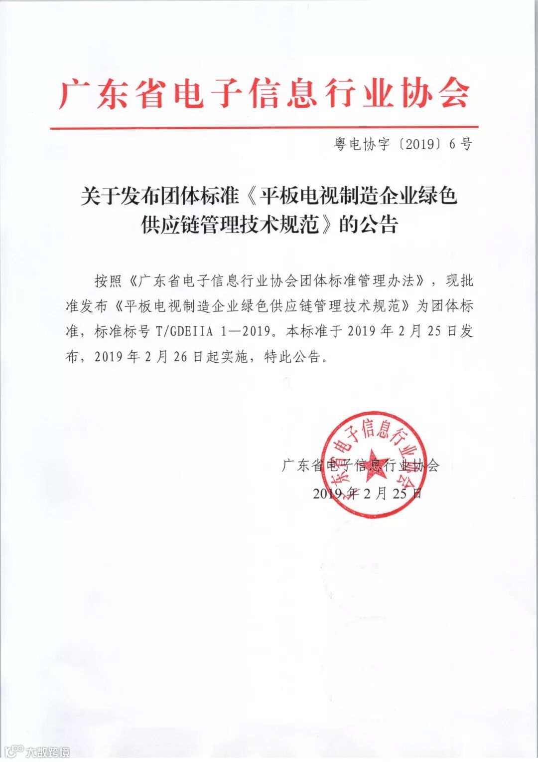 中国绿色供应链联盟广东省电子信息行业协会关于发布团体标准《平板电视制造企业绿色供应链管理技术规范》的公告 按照《广东省电子信息行业协会团体标准管理办法》,现批准发布《平板电视制造企业绿色供应链管理技术规范》为团体标准,标准标号T/GDEIIA 1—2019。本标准于2019年2月25日发布,2019年2月26日起实施,特此公告。
