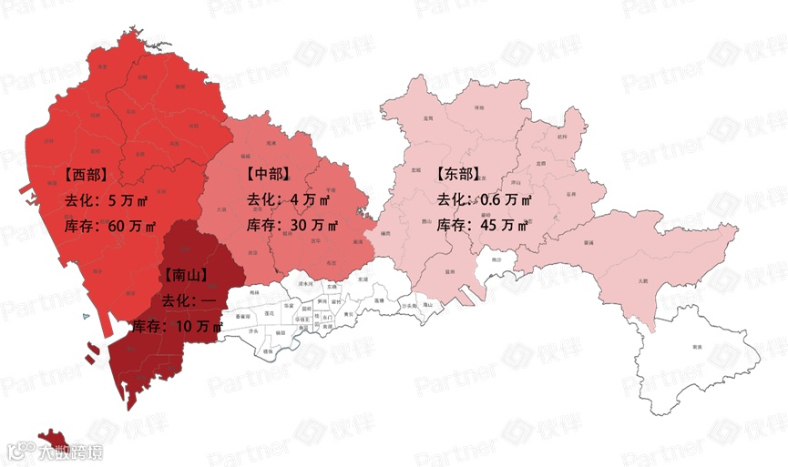 第2季度,西部库存量最大,宝安光明约有60万厂房可售量,西部(宝安光明)及中部(龙华布吉平湖)成交最多,其第2季度成交面积分别为5万㎡、4万㎡。