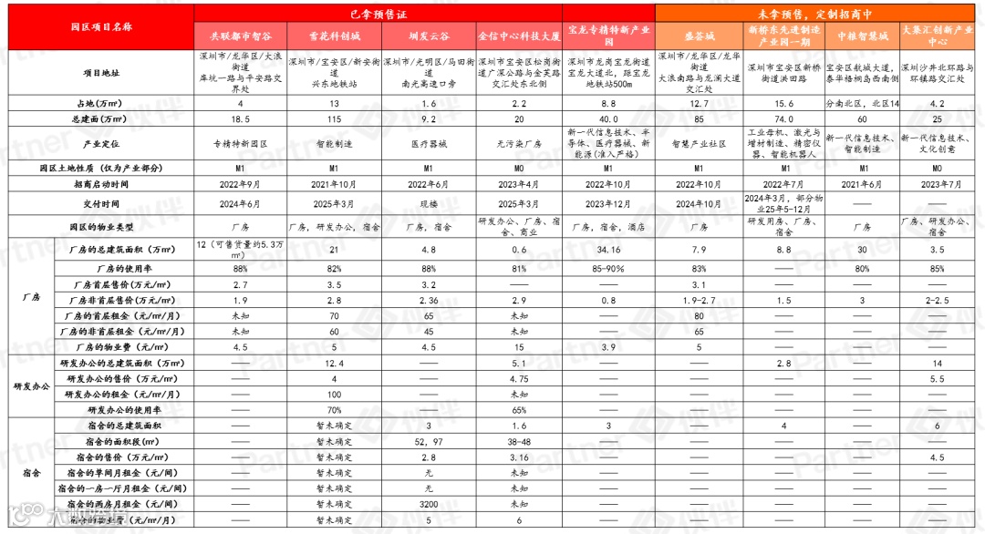 目前深圳厂房在售项目有9个,已拿预售证项目5个,未拿预售定制招商项目4个,除金信科技大厦、大集汇创新产业中心为M0用地外,其他项目均为M1用地。